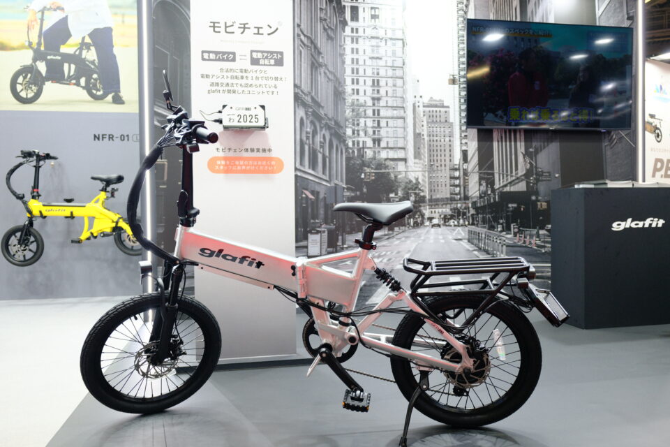 電動バイクと自転車を切り替えられるglafitの代名詞「モビチェン」を搭載した「GFRシリーズ」の最新モデル「GFR-03」を初披露。前作「GFR-02」との最大の違いは、自転車モードでも電動アシストが可能になり、7段変速ギアを搭載した点。さらに、タイヤサイズが14インチ→20インチ、バッテリー容量が9.6Ah→14Ah、モーター出力が250W→500Wと大幅アップし、NFC対応キーと前後サスペンションも新たにプラスするなど、スペック・デザイン共に進化を遂げました。