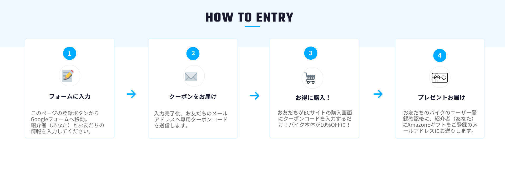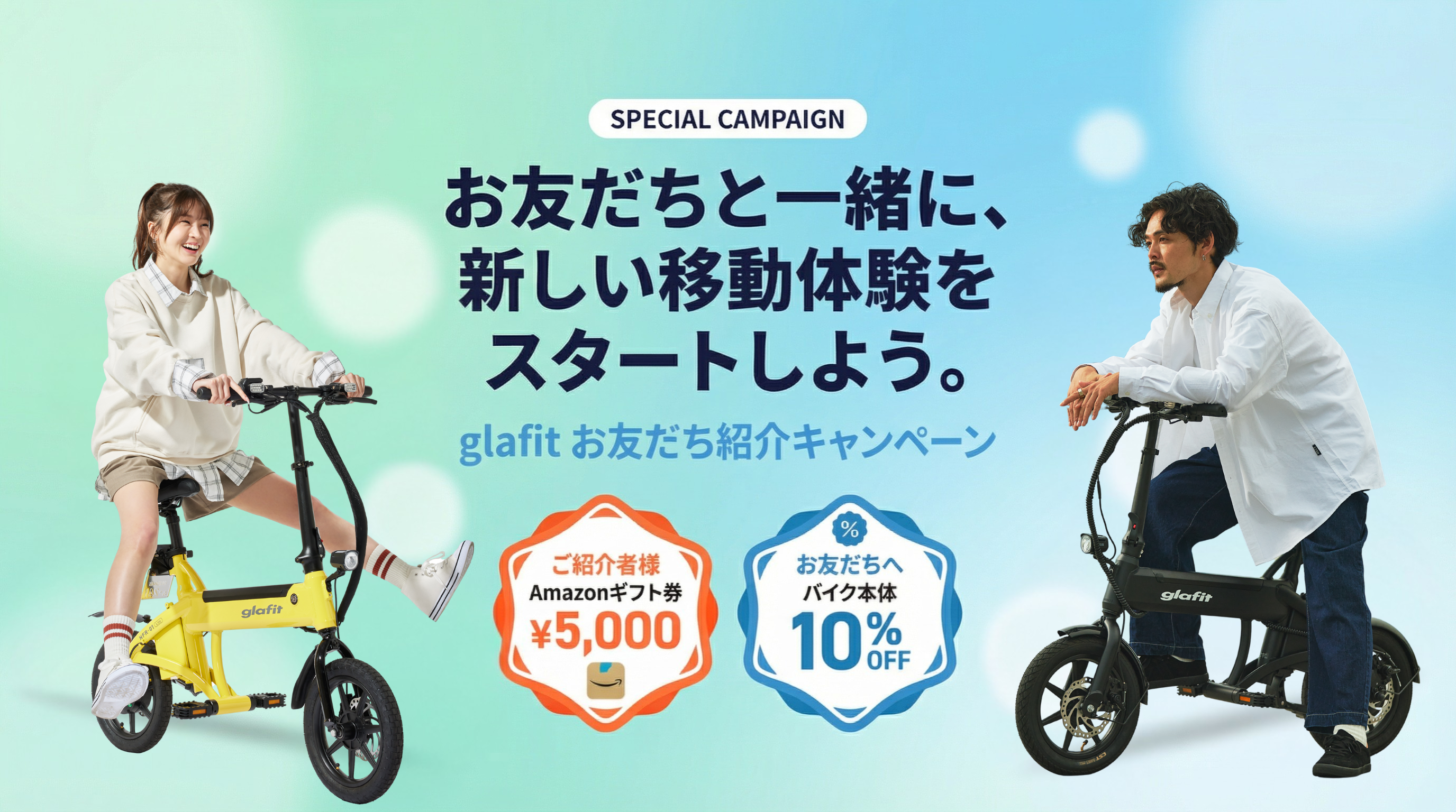 lp お友だち紹介 LP GFR-02納車までの流れ glafitってどんな会社? NFR-01 Lite TEST RIDE NFR-01Pro-GFR-02徹底比較 NFR-01Pro納車までの流れ NFRと道路交通法 USER’S VOICE USER’S VOICE_NFR お友だち紹介 はじめまして、glafitです モビチェンと道路交通法 修理・メンテナンスについて 春の全国一斉試乗会 電動サイクル お友だち紹介 お友だちと一緒に、新しい移動体験「電動サイクルNFR-01シリーズ」で一緒に移動をアップデートしませんか?ご紹介いただいたお友だちには、glafit公式オンラインショップでNFR-01シリーズのバイクご購入時にご利用いただける「10%OFFクーポン」をプレゼントいたします。また、ご紹介者の方にも、AmazonのEギフト5,000円をプレゼントいたします。皆さんのお友だちのご紹介をお待ちしています。 お友達紹介キャンペーンについて概要お友達をご紹介いただくと、紹介されたお友達に【10%OFFクーポン】、紹介者様に【Amazonギフト券5,000円分】をプレゼントいたします。キャンペーン特典お友達(購入者):glafitオンラインストア バイク本体10%OFFクーポンプレゼント紹介者様 :お友達の車体登録完了後Amazonギフト券5,000円分プレゼントキャンペーン参加方法① お友だち紹介登録から、以下の情報をご入力ください。 ・お友達の氏名 ・お友達のメールアドレス ・紹介者様の氏名 ・紹介者様のメールアドレス ・紹介者様の電話番号② 入力完了後、翌営業日までに上記入力いただいたお友達のアドレスへ10%OFFクーポンコードをメール送付いたします。③ お友達がオンラインストアにて対象商品購入時に、決済画面でクーポンコードを入力すると10%OFFが適用されます。④ 車体登録完了後、紹介者様へAmazonギフト券5,000円のギフトコードをメール送付いたします。対象車体・電動サイクルNFR-01 Pro+・電動サイクルNFR-01 Lite お友だち紹介登録 注意事項・紹介人数に制限はありません。複数名ご紹介いただけます。・クーポンのご利用はおひとり様1回限りとなります。・glafitバイクのオーナー様以外の方からのご紹介も可能です。・ご自身を紹介して購入する「自分買い」も対象となります。・クーポンのご利用はglafit公式オンラインショップでの対象バイク購入でのみご利用可能です。・他のクーポンとの併用はできません。・紹介者様へのAmazonギフト券は、お友だち(購入者様)の車体登録が完了した後に配布いたします。・本キャンペーンは予告なく変更・終了する場合がございます。・不正利用と判断した場合、特典対象外となる場合があります。