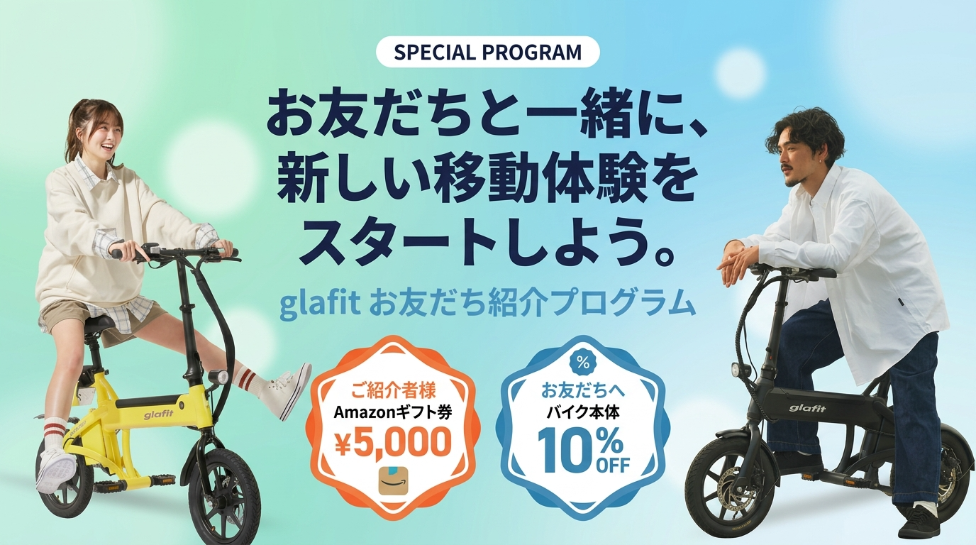 glafitの「電動サイクルNFR-01シリーズ」をお友だちにご紹介いただくと、紹介されたお友だち(購入者)にはglafitオンラインストアで利用可能な「本体10%OFFクーポン」を、紹介者様にはお友だちの車体登録完了後に「Amazonギフト券5,000円分」をプレゼントいたします。