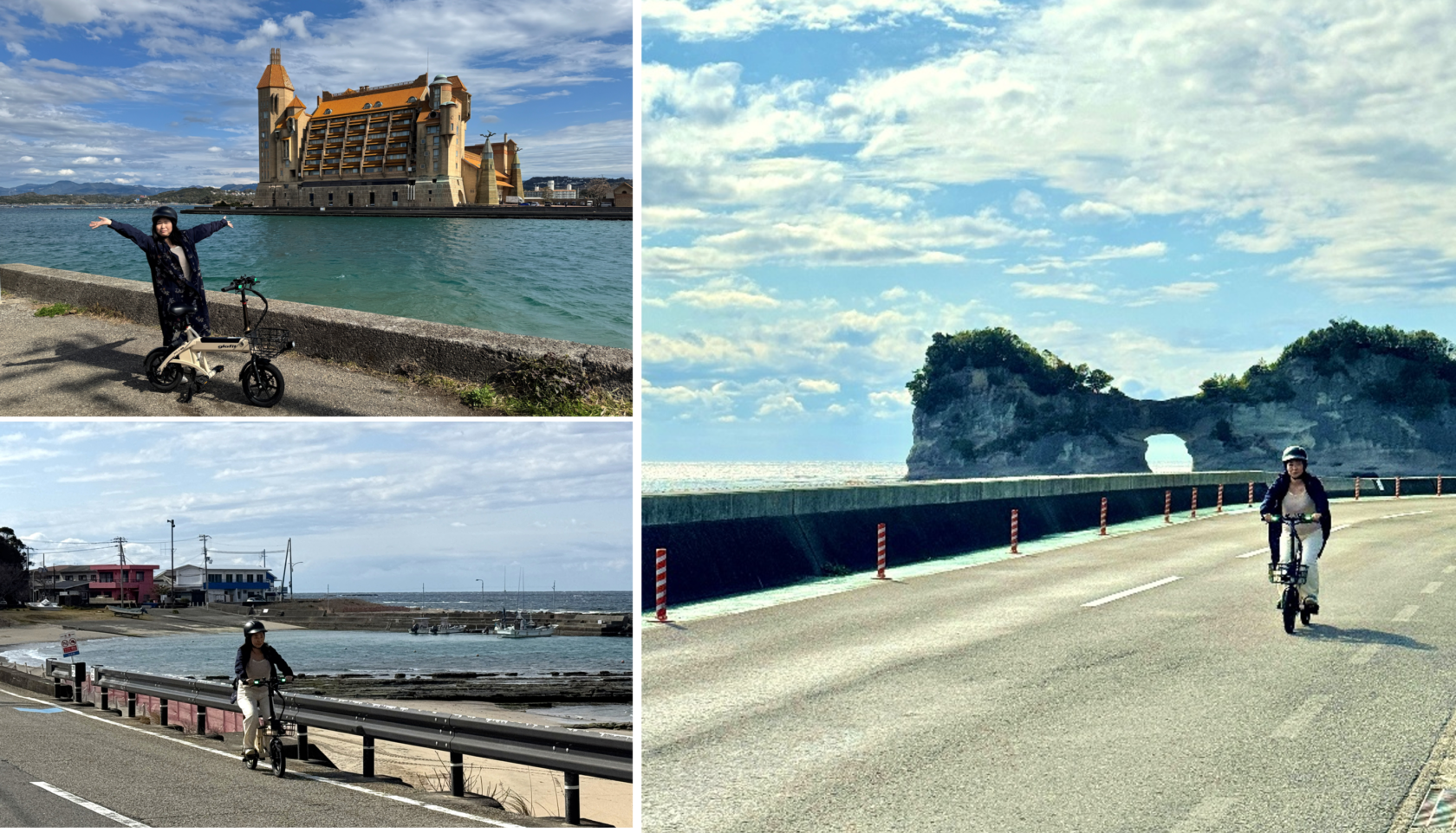 白浜町の北端にある江津良海岸方面まで、アイコニックなスポットをバックに海岸沿いを進みます。お城のようなラグジュアリーホテル「ホテル川久」を見つけたら、まずは記念撮影。思い立ったらふと車体を停めて記念撮影ができるのも、電動サイクルならではです。